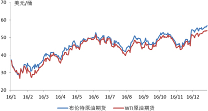 2016年初,国际金融局势不稳定,国际原油与其他大宗商品价格一同下跌,触及本轮下跌新低,1月20日、2月11日形成双底。从2月末至6月初,在一系列供给冲击的影响下,油价反弹超过了预期,最高达到50美元/桶以上。进入7月份,供给冲击因素的影响消退,油价一路下跌至40美元/桶左右。之后市场关注焦点转向OPEC减产协议,油价屡次拉升。最终,OPEC在9月份达成了减产协议,并在11月份落实减产120万桶/日的目标。非OPEC国家也达成了一个减产协议,共同助力油价以全年高点结束2016年的走势。(图1)