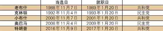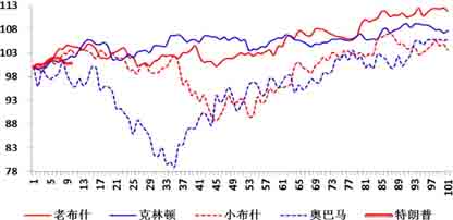 从1989年至今,美国先后历任了五位总统,在他们各自首次任职时百日执政期间,虽然各类美元资产表现有所差别,但背后似乎还是存在两党色彩的经验数据规律可寻。(表1)