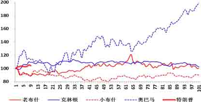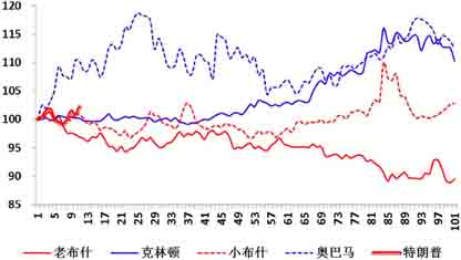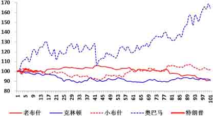 图2 五位美国总统就职100天内的10年期国债收益率走势比较