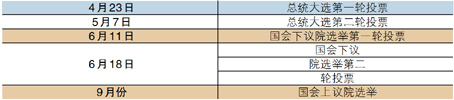 今年是法国大选年,鉴于法国总统选举实行的是“两轮制”,预计4月23日举行第一轮总统大选后,5月7日还将举行第二轮选举。另外,今年法国还将进行国会选举,其中国会下议院(国民议会)将于6月11日和18日全面重选,上议院将在9月份进行部分重选(每3年对二分之一的席位进行重选,在2011年和2014年的选举均在9月份举行)。