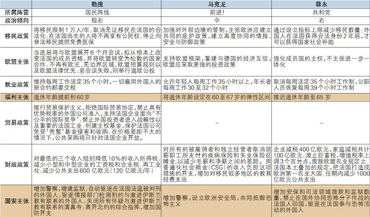 马克龙、勒庞和菲永的政策主张严重分歧主要存在于贸易、移民和欧洲一体化,其中由于勒庞主张贸易保护主义、严控非法移民和退出欧元区,被市场视作本次法国大选最大的不确定性。(表3)
