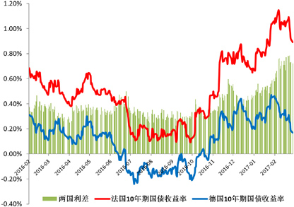 虽然民调的普遍共识是,勒庞可能赢得第一轮大选,但不论对手是菲永还是马克龙,勒庞都不太可能赢得第二轮大选,但2月份Leonie Hill Capital的CEO阿伦?康德曾表示,其公司专有的人工智能(AI)系统对搜集的数据分析显示,勒庞有望成为下一任法国总统。而在去年6月份英国退欧公投结果超预期,特朗普胜选等事件冲击下,市场对于勒庞胜选的不确定性已有反映,例如,法国10年期国债收益率与德国的利差已超过0.7%。(图1)