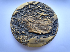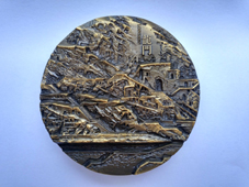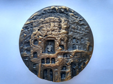 云冈石窟大铜章,正面图案为云冈石窟的远景,浮雕的手法结合凸面镜的设计理念,大写意地尽可能将云冈石窟的全景展现。章面星罗的洞窟,棋布的佛像,将石窟群的博大展现出来。宏伟地气势里有着古老的神秘,神秘的氛围牵动着一探究竟的思绪。