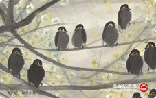 《梨花小鸟》画于1970年代,薄雾笼罩,10来只小鸟栖息在梨树枝头,是同行?是亲友?树枝纵横交错,鸟语花香,粉绿色的背景,是否寓意着曾经的美好而短暂?人生的“悲欣交集”?