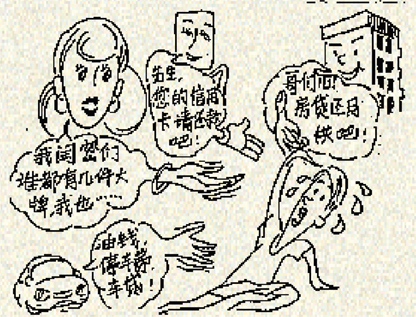 小明不敢轻易换工作了,看着自己越来越瘪的钱包,小明开始担心,一旦失去工作,就可能还不起这种种的贷款。