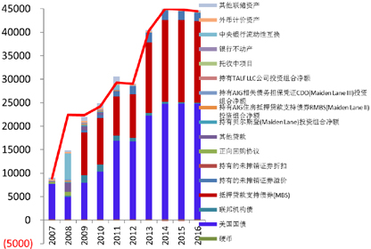 自2014年11月起,虽然美联储彻底结束了资产购买计划,但并未停止到期资产再投资,所以至今美联储的资产负债表规模始终稳定在4.5万亿美元左右,而且在经过长达6年的量化宽松之后,美联储的资产负债表的结构发生了巨大的变化: