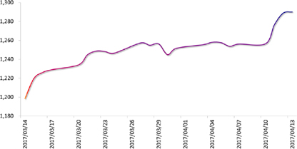 商品市场:上周,叙利亚和朝鲜问题带来的避险情绪继续发酵,黄金大幅上涨。周五收盘于1287.16美元/盎司,较前一周上涨2.69%。
