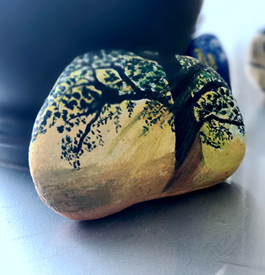 第一幅原创石头画,创作在2017年1月8日的晚上。这画的诞生,与初衷有点不一致。那天傍晚,悦子走在路上抬头看天时,对自己说,晚上我要画一幅蓝天银杏林。但晚上她参照的是自己的一幅自拍像,然而涂涂改改间,竟然变成了自己傍晚时分想创作的画。“潜意识真是了不起,终究带着我画了我想要画的。”她说。