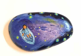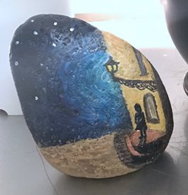 第一天做石头画是2016年11月9日晚上。那晚,悦子正在整理阳台,然后儿子小C过来说,妈妈,别做家庭妇女了,做艺术家吧。那一天,是悦子第一次在石头上做画。“他的,我的,我们的,太开心了。”