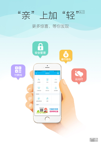 2017年3月31日,建设银行新版个人手机银行正式上线。新版手机银行采用“亲上加轻”整体设计理念,从“工具化交易”转变为“伙伴式关系”。以智能化、个性化、多样化的高频服务“亲”近用户。采用扁平化设计理念,提供“轻”量的交互体验,呈现简洁大气的页面风格。