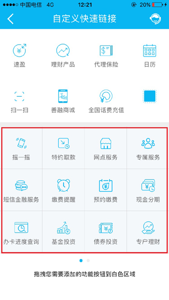 新版手机银行首页、投资理财首页菜单可模块化定制,用户可根据自己使用习惯自定义菜单界面,同时,提供多种主题色彩设置,满足不同群体、不同年龄段用户个性化使用习惯。如首页“财富”、“转账”、“快贷”、“龙支付”下方七个菜单可由用户自行选择展示,用户通过点击“+”进入自定义快速链接页面,从灰色区域拖拽需要的功能按钮至白色区域,即可将自己常用的服务功能在第一屏展示。