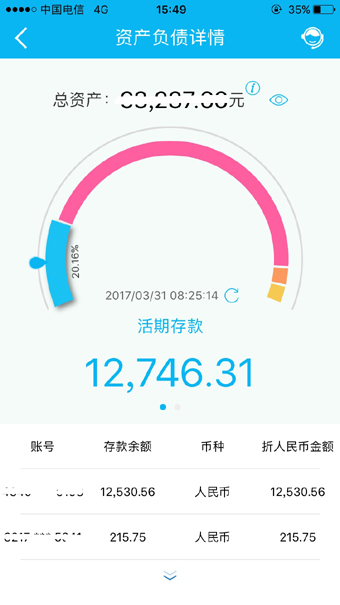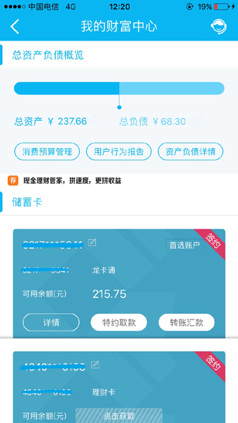 新版手机银行统一客户资产视图,整合客户资产负债情况,推出“我的财富中心”个人财富管理功能,通过资产负债概览提供全面的资产负债统计信息,卡片式的账户信息浏览及可视化图标分析,直观呈现账户信息。