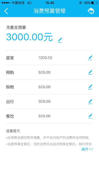 此外,财富管理功能提供“消费预算管理”和“用户行为报告”,从居家、网购、购物、出行、餐饮五大用户消费领域进行预算设置,若用户消费支出超过预算金额,建行将会及时进行消息提醒,满足用户资金使用规划需求;从投资、消费、结算三大维度详细分析用户各阶段资金流水情况,全面掌握个人资产收支状况。