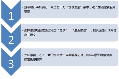 新版手机银行“悦享生活”频道为用户提供“优惠”、“我的悦享生活”、“附近”、“悦生活缴费”、“话费充值”、 “最近缴费”六大区域,其中“悦生活缴费”区域提供水、电、燃气等近70项生活服务,用户足不出户即享便捷生活,进入“我的悦生活”更可定制个性化常用缴费项目并定时手机银行或微信缴费提醒,通过“最近缴费”可快速根据之前缴费记录完成缴费,生活缴费更加方便、省时。