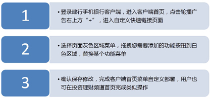 新版手机银行为用户提供定制个性化菜单功能,用户在客户端首页、投资理财频道首页均可以定制自己需要的菜单功能。同时,首页提供龙支付、快速转账、话费充值、外汇买卖等常用应用,用户可以根据自己需要添加常用应用并通过拖拽的方式自定义栏目展示次序。