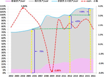 3.前两点决定了,美联储的缩表操作必须要保持弹性,鉴于是脆弱的复苏,所以需维持美国存款性公司资产总规模占GDP比重稳定在100%左右,也就是说美联储的实际缩表要视商业银行资产负债表的变化情况相机抉择,保持充分的弹性,操作过程不会是单向收缩,而会是双向操作,一旦商业银行重回缩表,依然需要美联储的扩表来对冲。