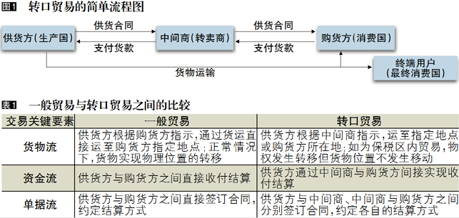 转口贸易又称转卖贸易或转手贸易,是指国际贸易中进出口货物的买卖,通常有三个交易参与方,交易货物不在生产国(出口商)与消费国(进口商)之间直接进行交易,而是通过第三方进行的转手贸易。整个交易过程,第三方通常作为中间商,将交易货物指定运输方直接从生产国运往消费国,中间商分别同生产国和消费国产生资金往来;或者,从生产国运往本国或第三国,在不经过加工的情况下运往消费国,一般情况下该货物进入本国或第三方的保税区域。(图1)