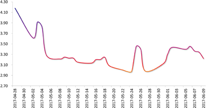 债券市场:受资金面紧张及去杠杆政策影响,国债短端收益率快速上行,但长端几乎不变,1年期国债与10年期国债收益率倒挂,收益率曲线极度平坦化。周五,10年期国债收益率报3.63%,与前一周持平。