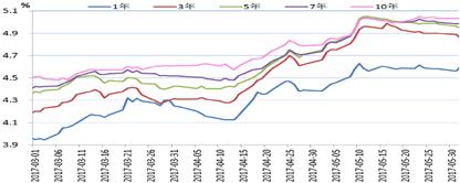 季末临近,资金面仍然偏紧,但或将平稳度过。6月面临季末多重因素及MPA考核影响,预计资金面易紧难松。但央行公开市场操作已然转向,并且央行近期公开表达维稳资金面的意图,预期6月份投放量将加大,虽然资金面偏紧预期不改,但市场或能平稳度过。