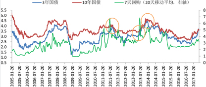 平坦化的曲线将得到修正。历史上收益率倒挂均出现在资金面偏紧及监管加强的背景下,从中债收益率曲线能够看出,类似的情况在2011下半年、2013年6月和2013年底也发生过。除2013年6月之后由于资金面偏紧,利率曲线陡峭化变动是由长端上行带动,另外两次均在资金面平稳之后,收益率曲线整体陡峭化下行。(图4)