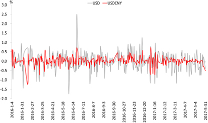 近期,由于特朗普爆出政治丑闻,市场甚至开始测算其被弹劾的概率,加之特朗普政府推出的税改政策不及预期,去年11月开始的“特朗普行情”大幅降温,美元指数快速下行。但是,在美元指数出现较大幅度回落的情况下,人民币兑美元汇率多数时间都在按照“收盘价+一篮子”机制确定的中间价的贬值方向运行。从图5中可以看出,此前,美元兑人民币与美元指数的日间波动方向趋同,只是幅度小幅收窄;但3月初后,美元兑人民币相对于美元指数的日间波动明显缩窄。且图6中可以看出,进入5月后,人民币兑美元即期汇率与中间汇率的偏离情况更加明显。(图5、图6)