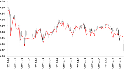 展望6月,人民币兑美元有望打破当前的窄幅震荡格局。从外部来看,美元指数快速下跌的势头有望扭转。当前美元的下跌是典型的消息驱动影响,经济基本面并没有实质性的变化,一旦特朗普政府的丑闻尘埃落定,且6月美联储货币政策会议上大概率将加息,美元指数有望实现小幅反弹,相应施加于人民币的压力可能增大。从内部看,“逆周期因子”的加入反映出监管当局维持人民币稳定的信心,人民币有望实现宽频双向波动。预计6月在岸市场美元兑人民币的主要波动区间为【6.75,6.85】。