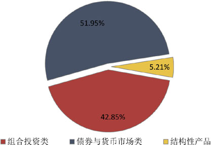 从投向类型来看,债券与货币市场类产品发行了4550款,环比增加115款,市场占比下降0.90个百分点至51.95%;组合投资类产品发行了3753款,环比增加283款,市场占比上升1.50个百分点至42.85%;结构性产品发行了456款,环比减少31款,市场占比下降0.60个百分点至5.21%。(图4)