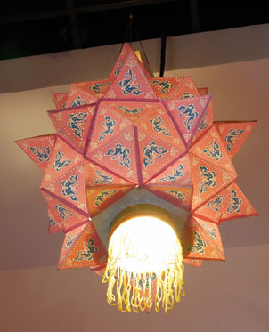 进入北边的展厅,天花板上挂满了无骨花灯,多彩的灯笼发出柔和的光亮。无骨花灯,顾名思义就是灯笼内没有硬物骨架来定型,全部由一块块丝绸或纸质的灯皮相互粘接而成,利用灯皮本身相互支撑形成的力量,使灯笼呈现出立体的结构。由于源自传统,它自身就含有一定的寓意,“无骨”花灯取其谐音便是五谷丰灯,无骨通五谷,这其实表达了古代劳动人民对于国泰民安、五谷丰登的美好愿望。