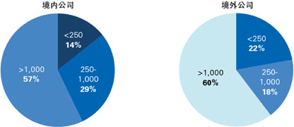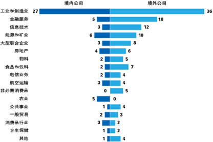 在该项调查的参与者中,工业和制造业公司占据了最大的比例,其中有27家分布在中国境内,36家来自境外。金融服务公司(5家在中国境内,18家来自境外)、信息技术公司(3家在中国境内,12家来自境外)以及能源和矿业公司(6家在中国境内,10家来自境外)加起来超过受访企业总数的四分之一。(图2)
