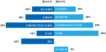 在受访的境内公司中,66%的企业从事出口业务、进口业务或进出口业务。在受访的境外公司中,61%从事面向中国的进出口业务,但受访企业中的另外30%则与其在中国的子公司进行进出口业务。(图4)