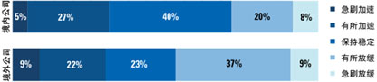 - 在受访的境内公司中,认为人民币国际化进程放缓和认为人民币国际化进程正在加快的企业数量相当。但是受访的境外公司更倾向于认为人民币国际化进程正在放缓