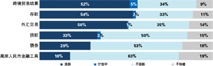 - 在过去六个月中,有36%的境内公司持有离岸人民币贷款,32%的境外公司持有离岸人民币贷款