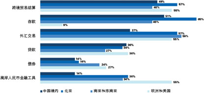 - 54%的受访企业在境外拥有人民币存款。持有人民币存款的北亚公司的比例(65%),而持有人民币存款的美国和欧洲的公司的比例较小(9%)