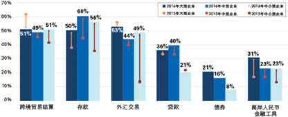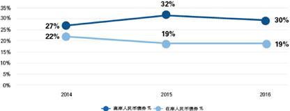 - 自2015年以来,使用离岸人民币存款的境内公司的数量有所增加(从2015年的33%增至2016年的51%)
