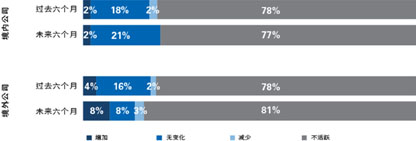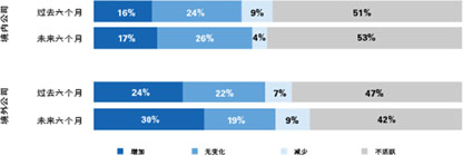 境外人民币债券的使用率低于贷款的使用率。在受访的境内公司中,仅有22%表示他们在过去的六个月中使用了债券,这一情况在未来六个月预计不会发生显着变化。