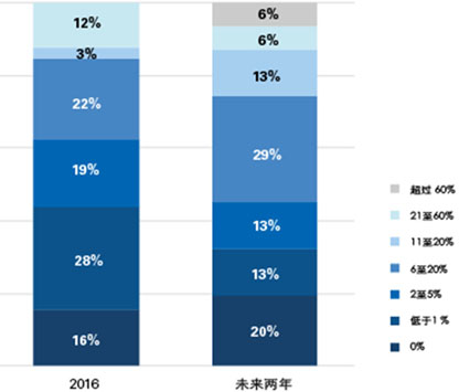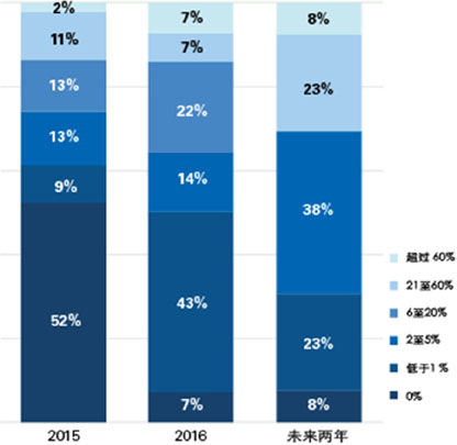 但是,一些公司已经在着力推动使用人民币进行国际贸易结算。主要借助于人民币(60%或以上)进行贸易结算的企业占比从2015年的2%增加到了2016年的7%。同样地,境外公司认为将增加其使用人民币进行交易的比例,尽管75%的境外公司表示这个比例很可能将保持在低于10%的水平。(图10)