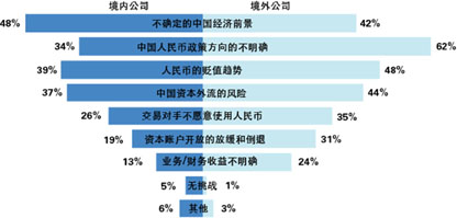 受访者被问及他们认为使用人民币进行国际贸易结算的最大挑战是什么。总体而言,他们表示,宏观因素,诸如中国经济前景的不确定性、人民币的贬值或是中国资本外流的风险,是最主要的。