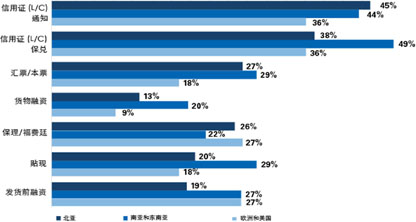 对中国境外的人民币贸易支付和金融产品的认识仍有待提高。只有不到一半的受访者了解市场上可使用的最标准的贸易融资工具——人民币计价信用证。了解其他产品如货物融资或保理的人就更少了。显然,银行需要面向企业客户加大相关产品的宣传力度。(图14、15)