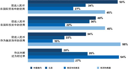 由于“一带一路”倡议的公布,受访的境内公司对人民币计价贸易增长的态度最为乐观。另一方面,南亚和东南亚受访者对此的态度最为迟疑,超过一半的南亚和东南亚受访者声称“断定该倡议对人民币使用的影响(如有)还为时过早”。北美和欧洲受访者广泛认为该倡议将更有利于使用人民币进行融资。