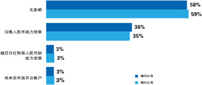 - 今年,58%的受访企业表示其并未感受到人民币贬值对其资金管理的影响,但也有 三分之一的受访企业认为人民币贬值给他们带来了直接影响