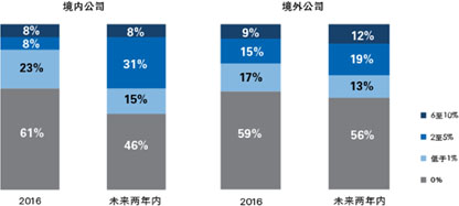 43%的境内公司表示他们只使用人民币进行很少一部分(少于1%)的跨境交易。很多企业预计未来两年其使用人民币进行跨境交易结算的数量将增加,且大部分企业预计人民币计价贸易的比例将增至2%至5%。70%的受访者预计这一比例仍将低于5%。