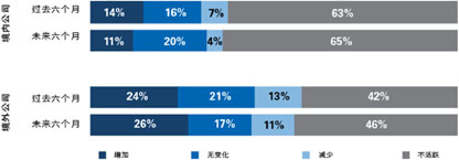 在受访企业当中,相比在境外注册成立的公司,有更多的在境内注册成立的公司持有境外人民币计价贷款。36%的境内公司表示,在过去六个月他们至少持有一种人民币债务,而且,还有4%的受访企业预计其在未来六个月将至少持有一种人民币债务。