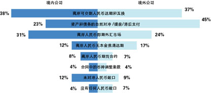 为了能准确找出阻碍机构投资者投资在岸人民币和离岸人民币计价资产的原因,我们询问了受访企业哪些因素会促使其扩大其敞口。