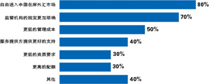 最常见的答案是,“进入中国在岸外汇市场的自由度”及“金融监管机构对现行的和即将发布的监管规定解释的清晰度”。