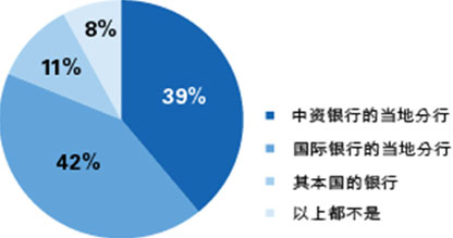 当被问及哪一类机构对人民币的发展更为了解、人民币产品能力更强时,受访的境外公司表示,他们对国际银行的当地分行和主要中资银行的当地分行没有明显偏好。各有约40%的受访企业分别选择了国际银行的当地分行和主要中资银行的当地分行。只有11%的受访企业选择了其本国的银行。