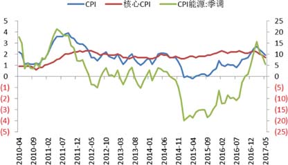 从上图中可以看出,能源价格的走势与CPI的走势高度相关,5月CPI的下降反映出能源价格的走弱。但剔除能源价格变化的核心CPI也表现趋弱,反映出食品、饮料以及交通等方面需求趋弱的迹象。如果说能源价格与OPEC、页岩油之间的博弈息息相关,波动剧烈,那么后者通常更为稳定,它的走弱令市场更加担心通胀回升的趋势正在逆转。