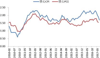 6月14日,美联储将联邦基金利率目标区间上调25个基点至1.00-1.25%,还发布了首份缩减4.2万亿美元国债和抵押贷款支持债券组合计划的行动路线,超出市场预期。但就在美联储这份决议出炉之前,美国5月消费者物价指数却意外下降,核心CPI较上年同期仅上涨1.7%,增幅连续第四个月下降,且为2015年5月以来最小。(图1)