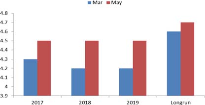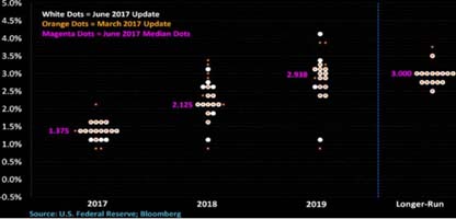 对于未来美联储的鹰派与鸽派程度,从点阵图观察,联储对于2017年的剩余期间的利率预测更加集中,中值集中在1.375%上下,暗示今年继续维持鹰派,年内加息或缩表概率仍大。但是美联储对于2018年和2019年的预测非常分散,虽然上升趋势明显,但幅度差异较大,低至1.00-1.25%,高至3.0-3.25%,显示美联储内部尚未就明年的利率预期达成高度一致,暗示明年美联储或许将没有今年表现得鹰派。