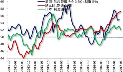 欧元区6月Markit制造业PMI初值 57.3,为74个月新高;此外服务业PMI初值 54.7、综合PMI初值 55.7,均为五个月新低。核心国家法国6月制造业PMI初值 55,为两个月新高;德国为59.3,为两个月新低。从制造业景气度看,6月欧元区经济增长势头稍有下滑,但平均来看,二季度的扩张仍属六年来最强劲。且德法和其他地区二季度经济增速也有所加快,显示这种上涨是有广泛基础的。