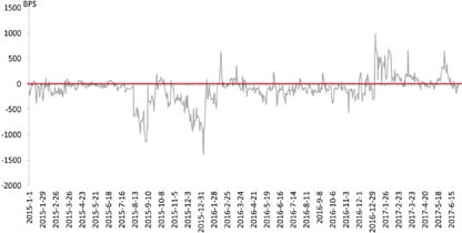 三是境内外人民币价格出现“倒挂”。2014年下半年至2016年,随着人民币贬值预期的逐渐升温,离岸人民币价格对此反应更大,在岸与离岸人民币价差往往表现为负值(见下图),即境外人民币价格更低。今年开始情况出现了明显变化,CNH比CNY更倾向于升值方向。除了监管政策的作用外,也进一步反映出人民币贬值预期降温。(图7)